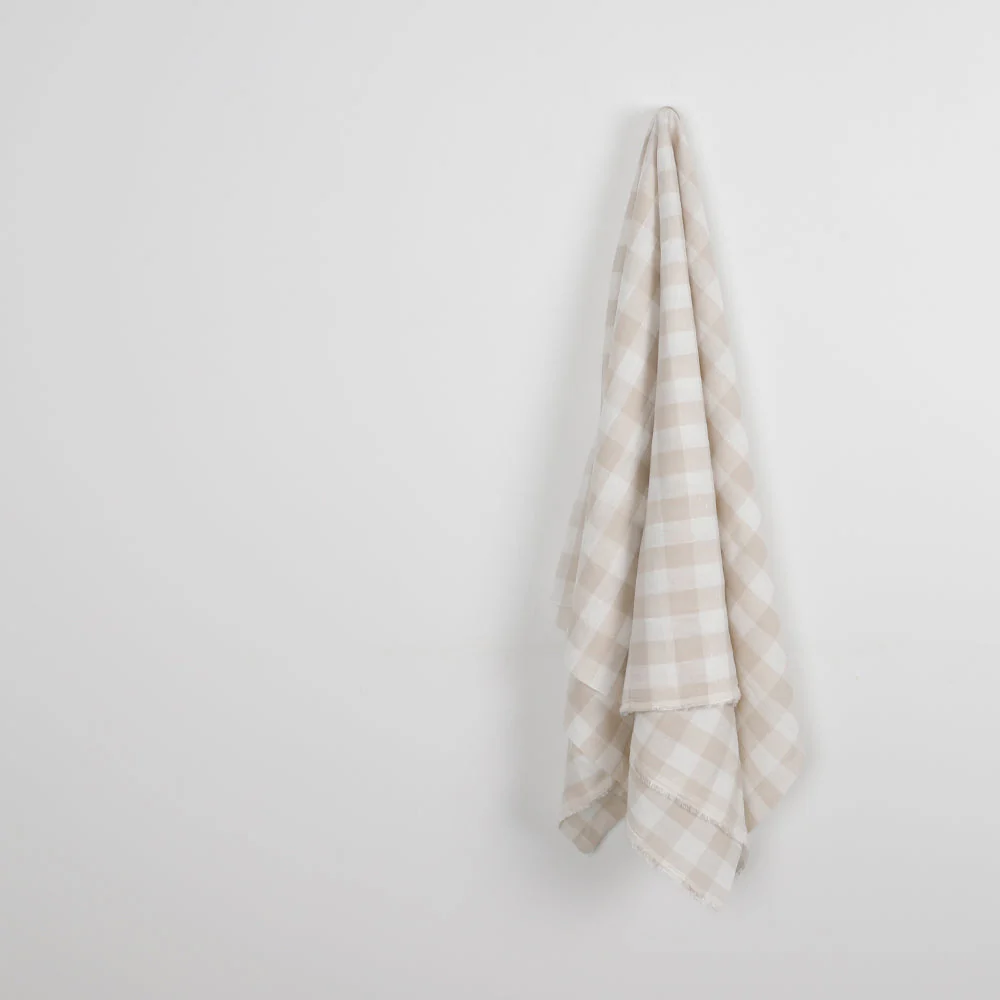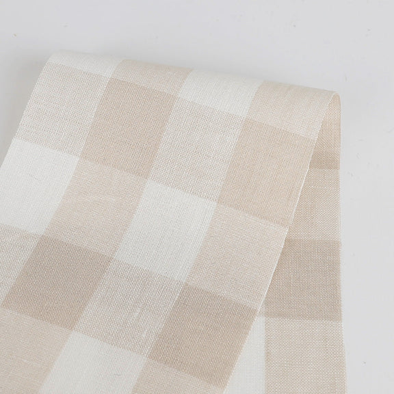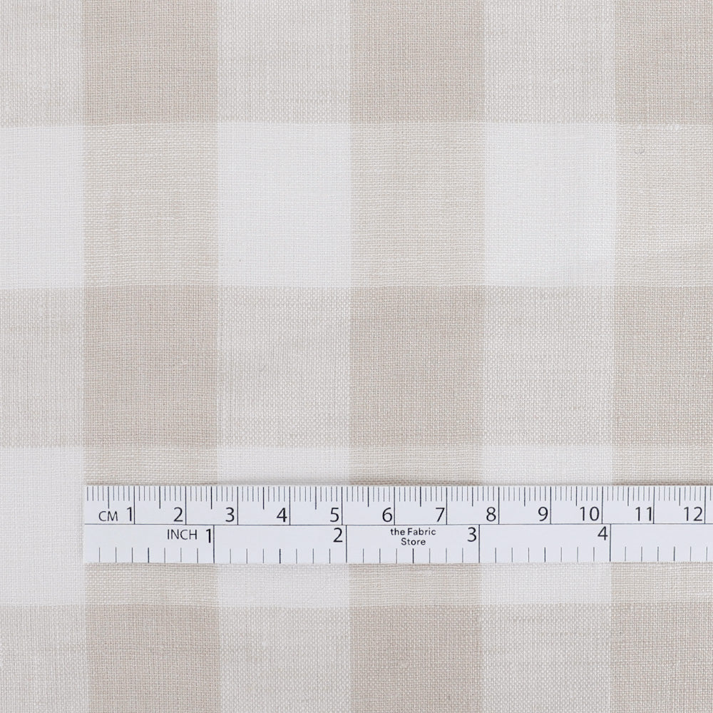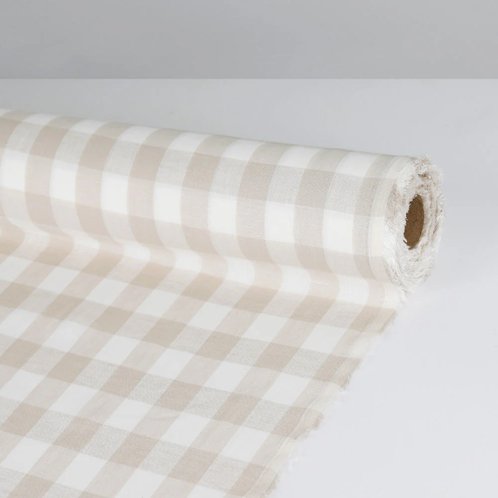 A super fun bold gingham linen in the neutral Bone colourway, part of our Exclusive Colour Range. This lightweight fabric is made from European Flax certified yarn, giving it a lovely earthy feel with subtle, naturally occurring slubs throughout. The yarn-dyed pattern features a rectangular gingham check design, with individual rectangles measuring 26mm by 31mm, created by a white and Bone striped warp and weft. This non-stretch fabric offers versatility for both fashion and lightweight soft furnishing projects.
