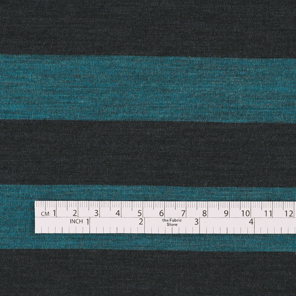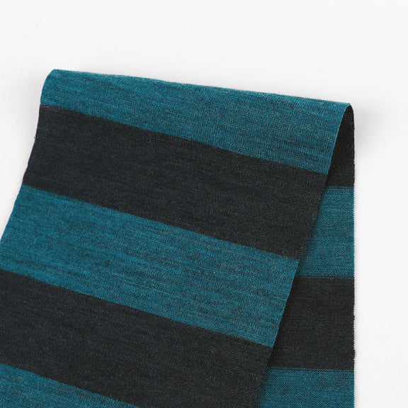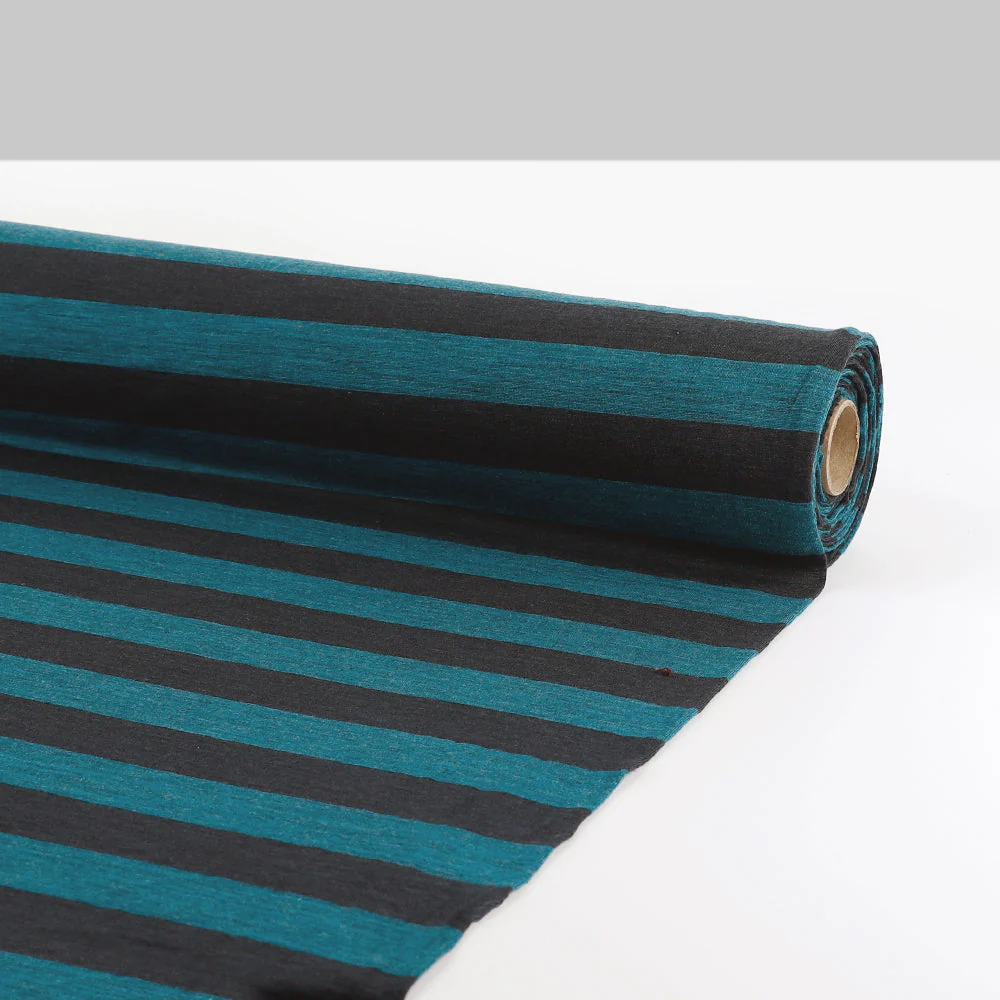 A midweight pure Merino in a rich Deep Sea Blue colourway with a striking yarn-dyed horizontal stripe design. The pattern alternates between teal marle and dark blue marle, creating a bold and sophisticated look. This single jersey fabric is super-soft and lightly textured, offering natural mechanical two-way stretch for enhanced comfort and flexibility. The fabric’s semi-transparent effect when stretched and naturally occurring slubs throughout add unique character and depth.
