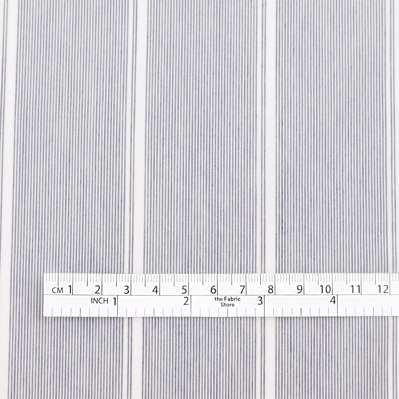 A deadstock cotton/poly micro stripe shirting in a timeless navy blue and white colourway. This lightweight fabric features a yarn-dyed alternating stripe warp with a white weft and a break in the stripes every 4cm. Woven in a tight plain weave, it has a crisp texture, matt finish, and no stretch, making it a classic choice for shirting and more.