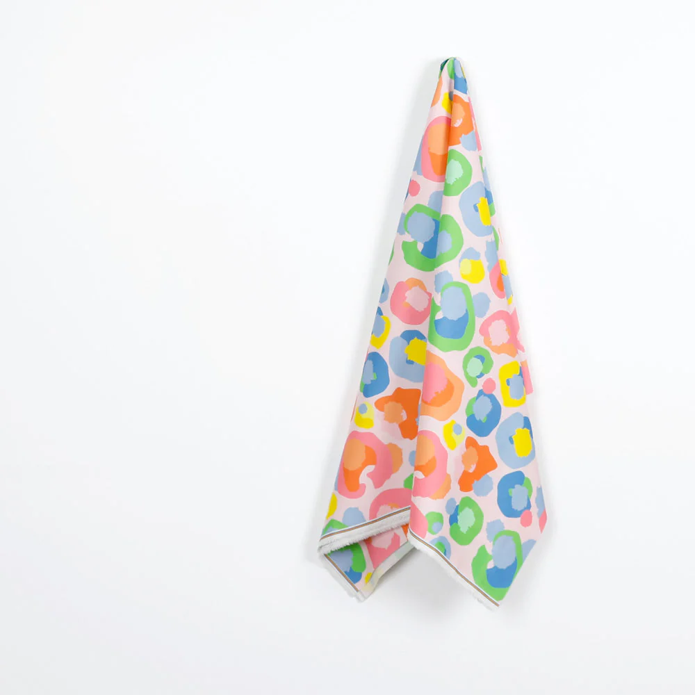 A versatile stretch cotton sateen in a playful blue and pink colourway. This midweight fabric is tightly woven in a sateen weave structure, featuring a subtle sheen on the face and a flat, matt reverse. The digitally printed design showcases vibrant paint splotches in blue, green, orange, and yellow on a light pink base, adding a lively and artistic touch. The fabric is almost opaque with 10% width stretch and no stretch along the length, making it both stylish and functional.